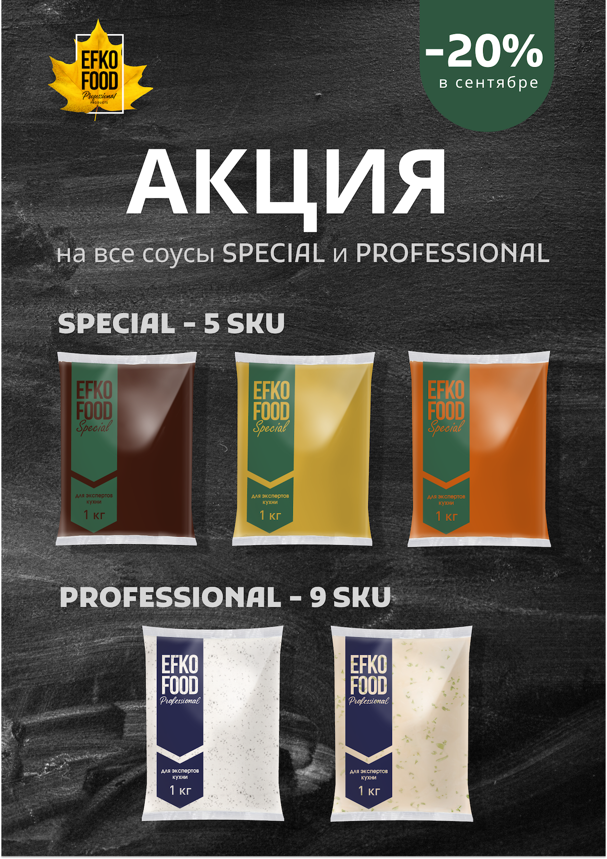 | Продукты для ресторанов | | | | Акция на соусы EFKO FOOD весь сентябрь 2024 г. | | | Уважаемые партнеры! Спешим сообщить вам, что весь сентябрь 2024 года на все соусы линеек SPECIAL и PROFESSIONAL от EFKO FOOD будет действовать скидка 20%. Ассортимент акции: - Соус Efko Food professional 1 кг 35% Сырный балк