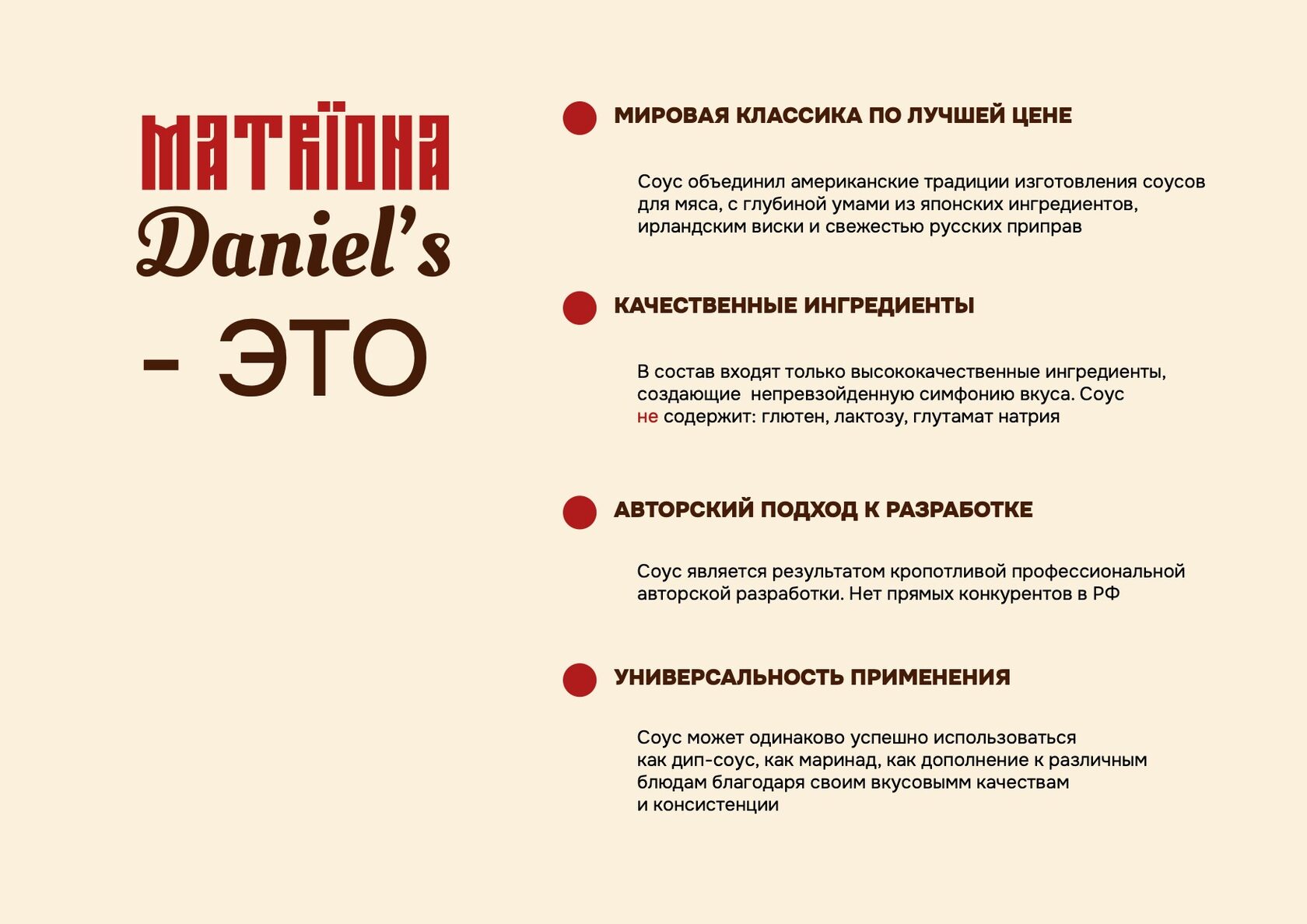 | Уважаемые партнеры! Рады представить вам новинку ассортимента Берёзки Фуд - Соус МATRIONA DANIEL’S! Соус наносится на конечный продукт, не подвергается длительной термообработке. При нанесении его, например, на ребра возможно использовать горелку для обжига, чтобы раскрыть вкус. Поставляется в упаковке балк по 1 кг.
