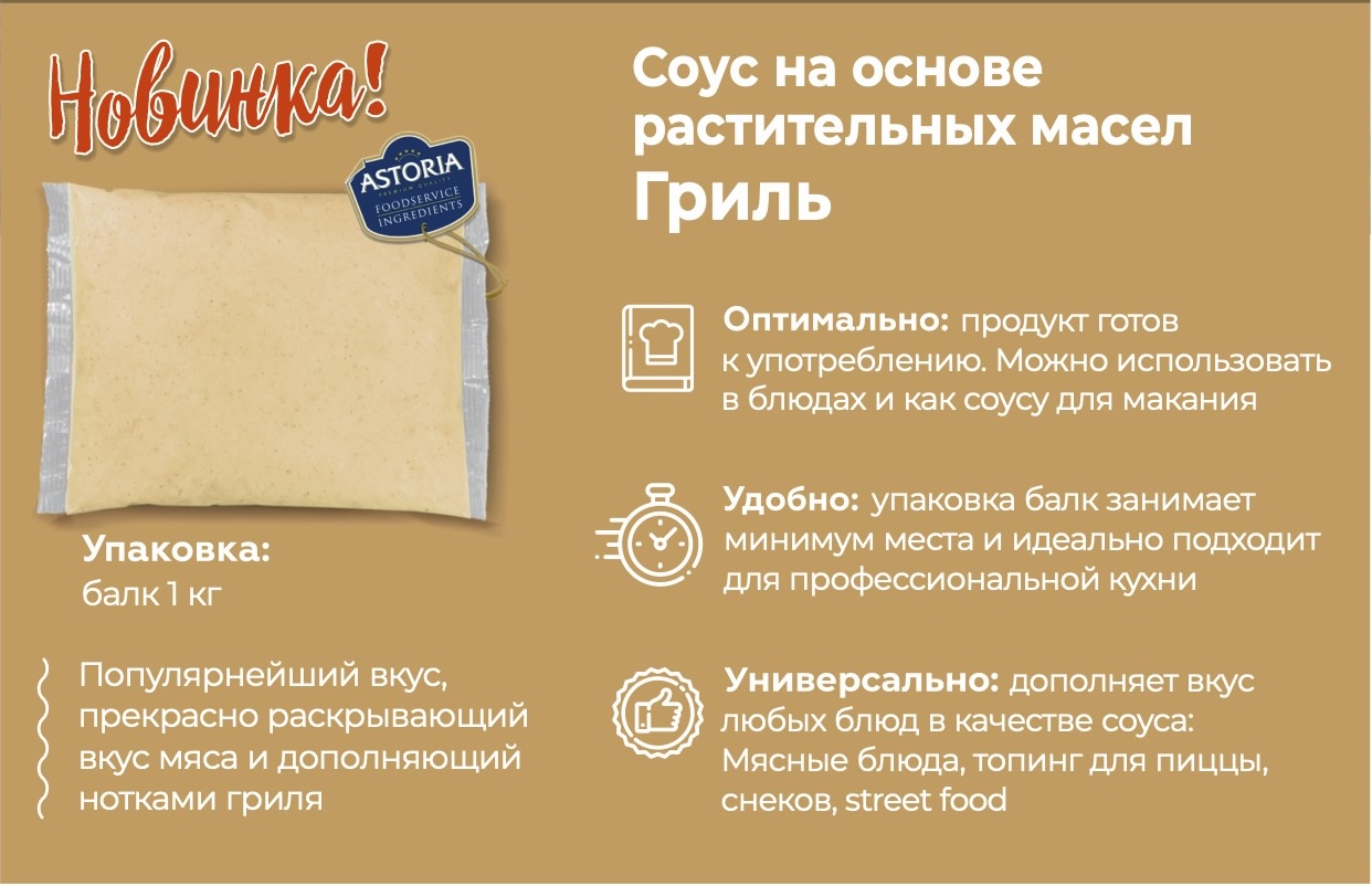 | Уважаемые Партнеры,! Сообщаем вам, что соус «Гриль» теперь в ассортименте соусной линейки Астория! Соус «Гриль» Хит продаж во вкусовых соусах, все потому что – это универсальный продукт, который можно использовать, как ингредиент в гамбургерах и других блюдах, а так же как самостоятельный продукт: соус компаньон для снековых тарелок.