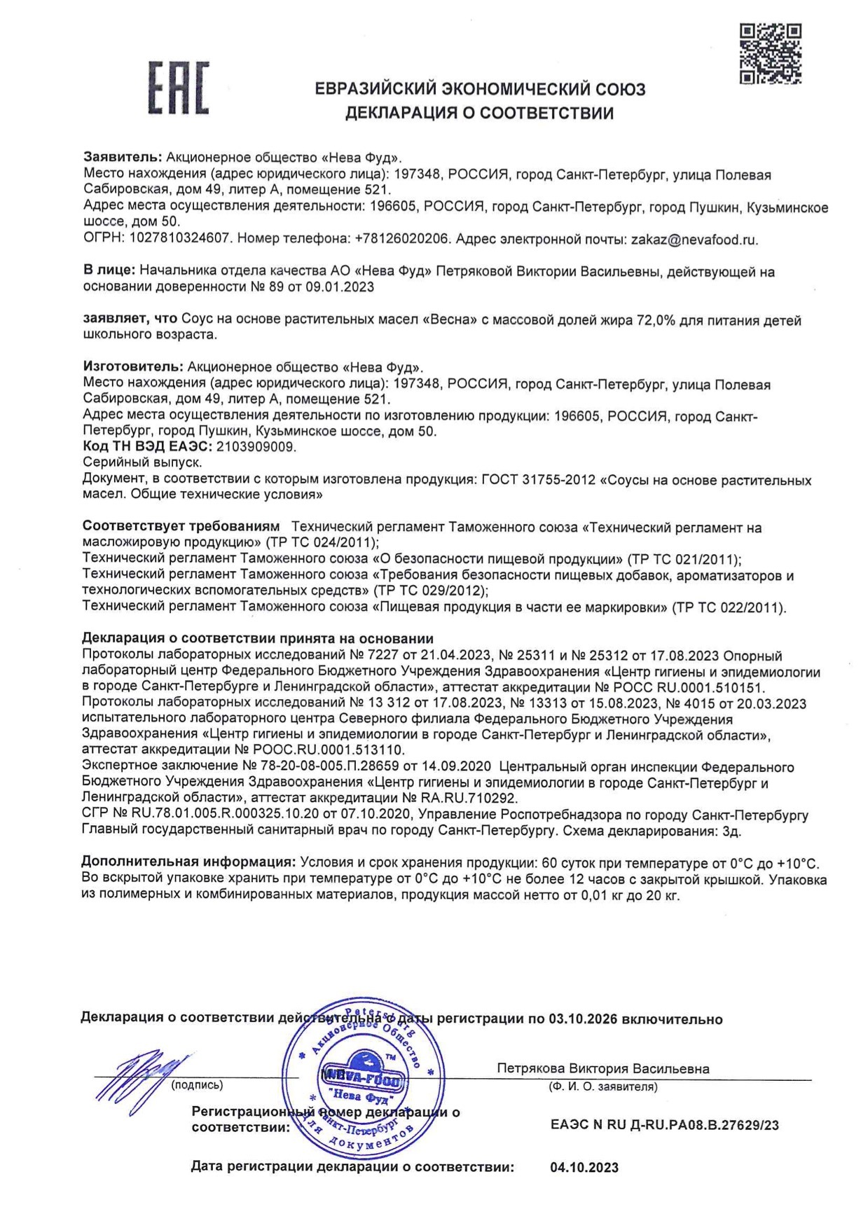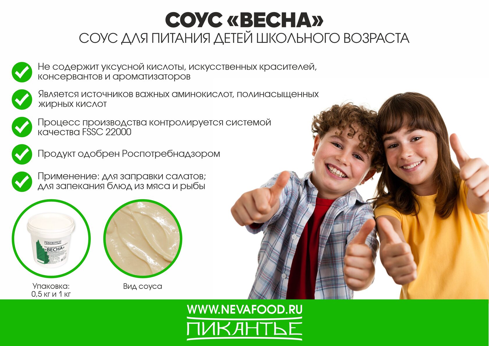 | Уважаемые партнеры! Мы рады представить вам соус для школьного детского питания Весна. Это эксклюзивный продукт для поставки в различные детские учебные заведения, колледжи и т.д. Соус Весна уже одобрен Роспотребнадзором, процесс производства контролируется системой качества FSSC 22000.